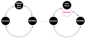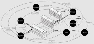 The key to making INFONAVIT work is to find an entity that operates within a specific local territory and can effectively organize individual homebuyers as a community. We thus proposed to bring the employer back to the game. Employers are excluded from INFONAVIT’s existing housing provision model, but because it is in companies and factories that workers form a lot of their social ties, employers have the social capability to better voice individual employees’ collective demand during the process of housing development. In addition, many companies own properties in the city, so the involvement of employers can also potentially grant INFONAVIT and the developers precious access to core urban locations. We thus imagined a new type of workers’ housing that is negotiated by the employers and physically constructed on top of the employers’ properties. In this model, the residential community is closely tied to the work community.