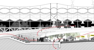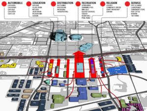 This new way of imagining food, highway, and the city puts great emphasis on the social diversity of the city’s everyday life. Urban experiences should not only concentrate in the downtown or pedestrian-only zones; they could in fact go along with driving. Social relations, events, spaces, and business landscapes can be more fluid than they currently are. The design’s policy implication is that 1) greater public-private partnership is imperative and 2) investments of this kind need careful phasing. This endeavor by its nature involves multiple government agencies as well as a number of private stakeholders. The City’s Transportation Department should make the first move and build the ramps and secondary roads that connect the highway to the neighborhood; at the same time the Parks Department can begin transforming empty lots into farmlands. Neighboring businesses should be incentivized to co-manage the farmlands and keep their revenue – this can reduce the government’s burden of maintaining capital assets. Architectural Conditioners are needed as farming equipment, which should be subsidized by the Small Business Department or the city agency in charge of economic development, because these customizable Conditioners are designed to also attract food and produce vendors, ultimately contributing to grow business opportunities on the side. As populations from both the highway and the neighborhood congregate on the site to eat, the demand for other services increase and the neighboring businesses, who have been managing the farms, can now decide to invest in capital expansions of their own establishments. Their new buildings will further anchor the life and development of the site. Via careful allocation of responsibility and strategic phasing of investments, this model will generate rewards for both the public and the private sectors. The private entities gain by getting access to the commuter market – this benefit is especially precious for small vendors. The government gains as the redevelopment of these vacant lots along the highway can create jobs (both during and after the construction), address urban blight, and increase the city’s tax base.