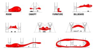 My first design response was a steel-frame prototype, combined with inflatable materials, that would be placed along exit ramps and parking lots. The structure is a mimicry of the Drive-Through restaurant, but much smaller in size and intentionally simple and customizable. Local food producers – there are plenty of them in Houston – can rent these mini structures to run their establishments, adjust the structures’ heights, shapes, claddings, and visuals, and produce various spaces to vend to the drivers and people living nearby. The simplicity of these structures allows for maximal customization, creating conditions to make and sell different types of food as well as different atmospheres of eating. I call these structures “Architectural Conditioners”, and they are the first step in envisioning a new food system for the city.