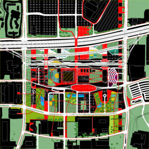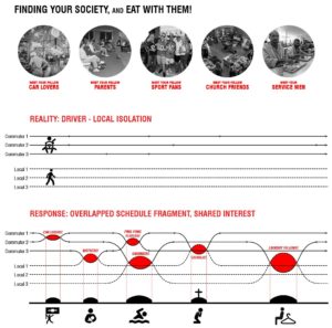 Besides allowing individual vendors and customers to set up points of casual encounters, the project further encourages the commuters to eat socially by searching for the overlaps of social circles among the driver population. Although commuters tend to eat quickly and move fast, if people can find shared fragments of their busy schedules (such as dry cleaning and daycare) or some common interests (such as sports), they might be willing to eat together while doing these other things together. So, I chose a particular vacant land along the I-610 Loop as my experiment site and studied its programmatic context; it was was surrounded by car dealerships, food factories, schools, hospitals, and industrial parks. In my design, I proposed to extend these businesses and their related services onto the empty land in order to anchor the population, and the Conditioners will serve as the structural frames for the new buildings. These buildings and the roads intersect, in different ways, creating various types of connections where people meet. For example, when the daycare center and the food truck road intersect, the junction is built as an auditorium, where the vendors can teach the kids how to cook. These places essentially serve both the people who are moving fast and the population who stay for longer, allowing commuters to enjoy and attend to other activities while eating. By weaving together eating and these other activities, the design puts additional flavors to food, encouraging the commuters to eat socially.