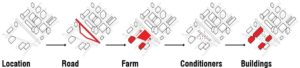 When the buildings and the roads form a grid, they leave open spaces in between, which provide opportunities to grow food on site. These small farms initiate further interactions between different social groups. Because the farms are always in between two buildings in this design, I propose that the neighboring buildings’ owners shall co-manage the farm. The Conditioners can be plugged in as farming and irrigation equipment, and they can also be used by non-farming activities managed by the neighboring buildings. For instance, next to the daycare center, the Conditioner and pathways form a maze, within which the kids can play miniature golf. Next to the church, the booster pump for the reservoir can also function as a baptistery. In this way, the Conditioner builds the important overlap between food production and other businesses and services, so that farming is not only geographically in the city, but also programmatically part of people’s everyday life.